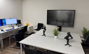 Dieser Raum ist mit Kamera, Mikrofonen, Beleuchtung und einem Greenscreen ausgestattet und ermöglicht die Aufzeichnung von Videomaterial. Mithilfe der Greenscreen-Technik können in der Nachbearbeitung unterschiedliche Hintergründe digital ergänzt werden.
