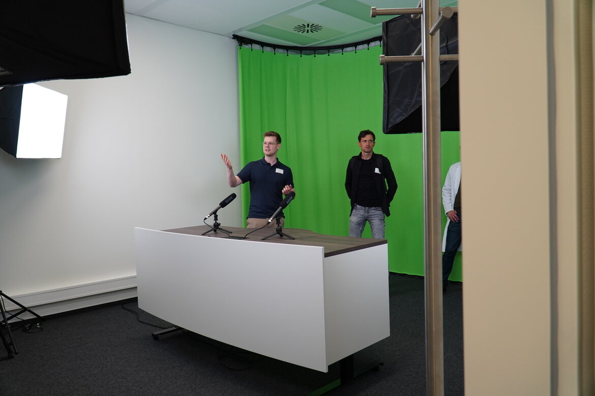 Dieser Raum ist mit Kamera, Mikrofonen, Beleuchtung und einem Greenscreen ausgestattet und ermöglicht die Aufzeichnung von Videomaterial. Mithilfe der Greenscreen-Technik können in der Nachbearbeitung unterschiedliche Hintergründe digital ergänzt werden.