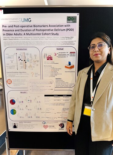 Our PhD student of the 1st cohort Fatima Irfan (RP8, Principle Investigator Prof. Dr. von Arnim) presented her poster entitled “Pre- and Post-operative Biomarkers Association with Presence and Duration of Postoperative Delirium (POD) in Older Adults: A Multicenter Cohort Study” at the 20th Annual Meeting of the European Delirium Association (EDA). The EDA took place from took place from November 12th to 14th, 2025 in Hamburg.