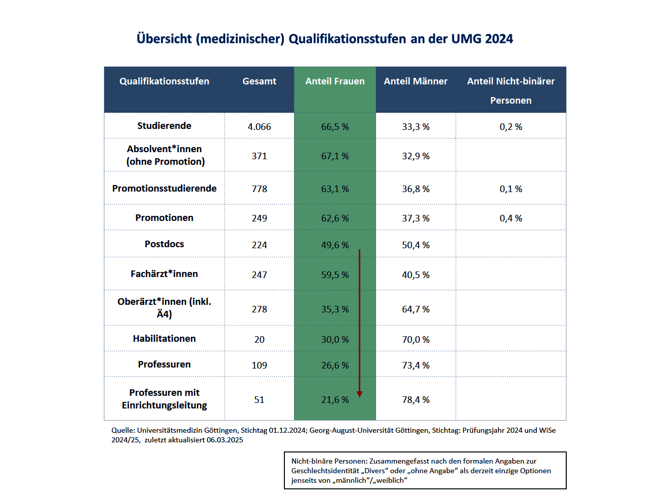 Die Universitätsmedizin Göttingen (UMG) begreift Gleichstellung als Querschnittsaufgabe und strebt in allen Arbeitsbereichen und Handlungsfeldern Geschlechtergerechtigkeit an. Der Gleichstellungsplan dient als Planungsinstrument und Selbstverpflichtung, um Unterrepräsentanzen zu beseitigen, strukturelle Ungleichheiten abzubauen sowie Studien-, Forschungs- und Arbeitsbedingungen besser mit dem Familien- und Privatleben zu vereinbaren. Der aktuelle Gleichstellungsplan ist vom 01.01.2022 bis zum 31.12.2027 gültig.