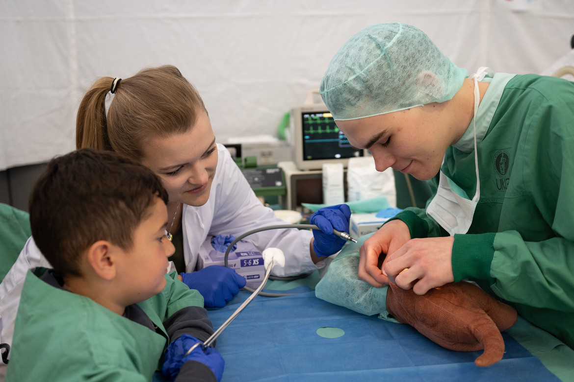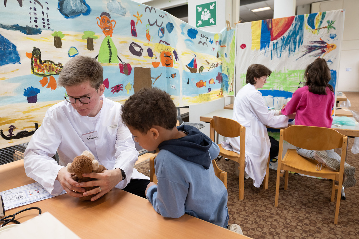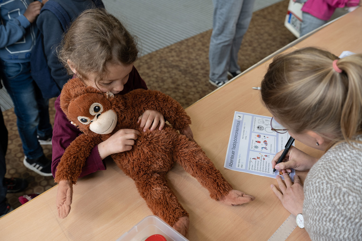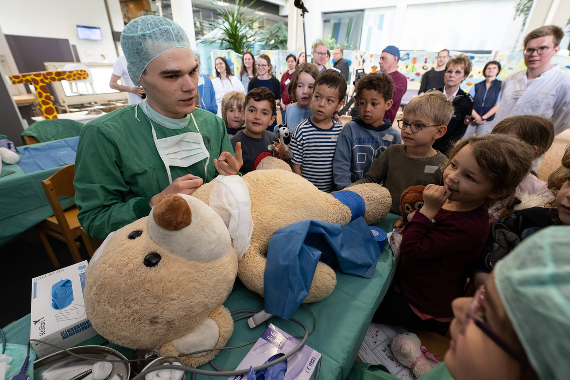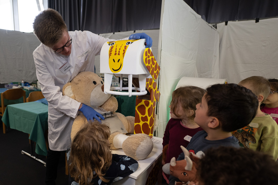 Das „Teddybär-Krankenhaus“ ist ein Projekt der Medizinstudierenden an der UMG. Sie wollen den Kindern auf diese Weise den Umgang mit Krankheit und den Kontakt mit Ärzt*innen spielerisch näher bringen und erleichtern. Wie in einem echten Krankenhaus wird geröntgt und operiert, eine Apotheke versorgt alle Patient*innen mit der nötigen Arznei. Schirmherr des Projekts ist Prof. Dr. Thomas Paul, Direktor der Klinik für Pädiatrische Kardiologie, Intensivmedizin und Neonatologie der UMG.