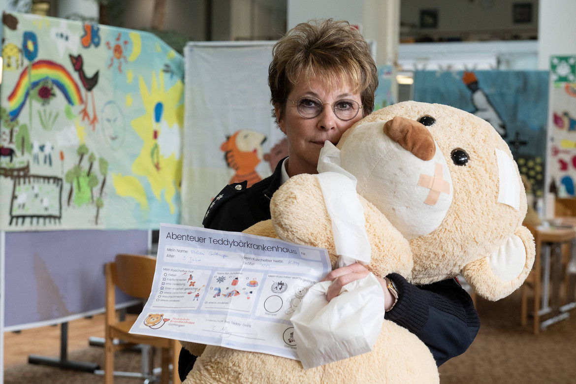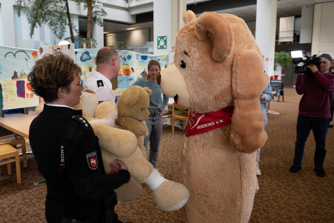 Ein ganz besonderes Ereignis: Die Polizei Göttingen kam mit einem Streifenwagen und Blaulicht vorbei. Jasmin Kaatz, Pressesprecherin der Polizei Göttingen, und Polizeioberkommissar Thorsten Ballhausen, Kontaktbereichsbeamter, brachten ihre beiden Findlinge, die großen Teddybären Kitty und ihren Freund, für eine Routineuntersuchung bei den Teddydocs vorbei. Kitty hatte sich noch am Morgen verletzt, auch ihr schweigsamer Freund wurde auf Herz und Nieren untersucht. Das Maskottchen der Kinderherzklinik der UMG, der Bär „Pauli“, begleitete die beiden großen Teddybären bei den Untersuchungen. Gut versorgt konnten beide Teddys mit dem Streifenwagen wieder zurück ins Polizeipräsidium fahren.