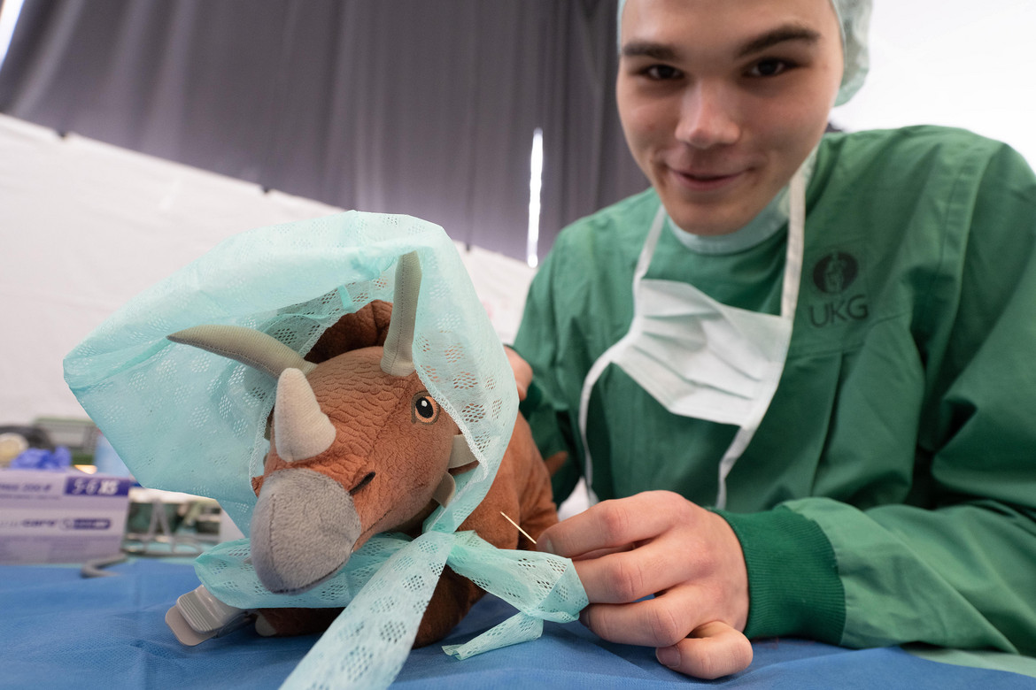 Bereits seit fünf Jahren dabei: Medizinstudent Dominik Hubricht im OP des Teddybär-Krankenhauses. Er hatte alle Hände voll zu tun, da dieses Mal ungewöhnlich viele Knochenbrüche und Verstauchungen zu versorgen waren, so bei Polizeibärin Kitty, der das Bein geschient werden musste, oder dem Lämmchen von Alida, oder dem Onkosaurus, den Elias mitgebracht hatte und der genäht werden musste.