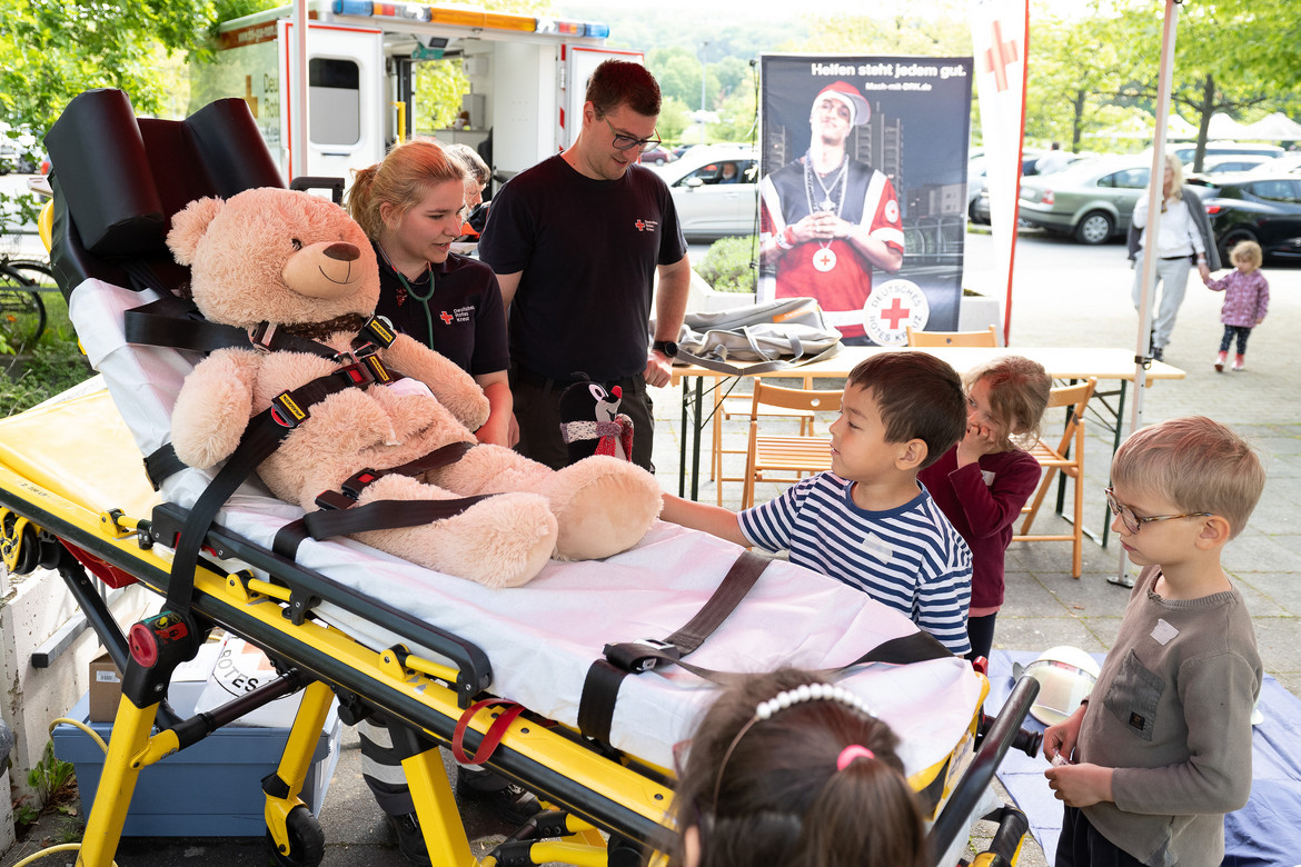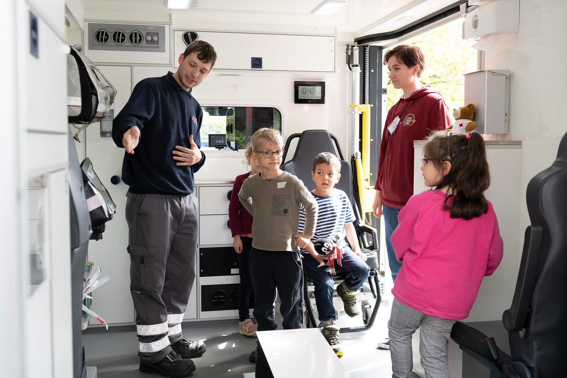 Unterstützt wurden die Teddy-Docs vom Deutschen Roten Kreuz (DRK). Vor dem Eingang zur Osthalle des Uniklinikums Göttingen zeigte das DRK den kleinen Puppen- und Kuscheltiereltern einen Rettungswagen und erklärte die einzelnen Funktionen der Ausstattung, das Blaulicht und die Aufgaben bei einem Notarzteinsatz.