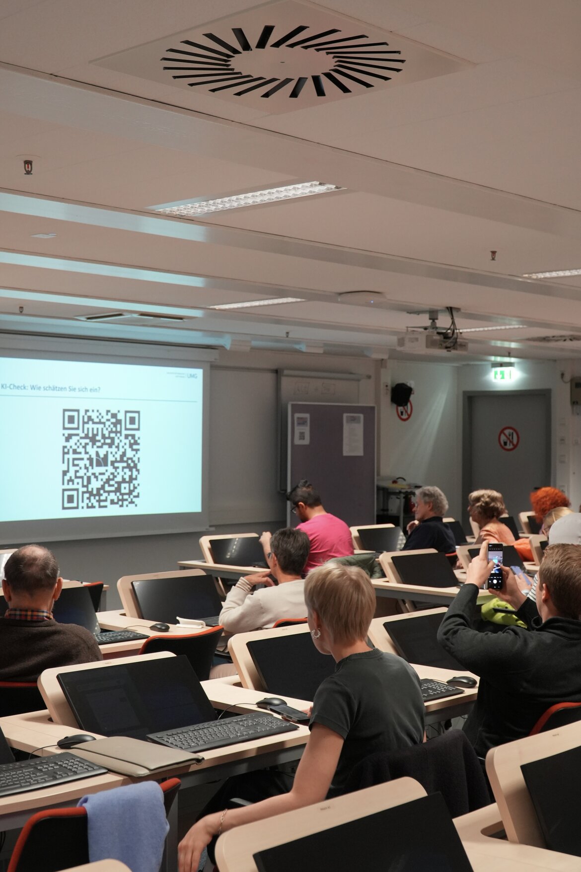 Lehrende und Studierende der UMG waren eingeladen sich über Einsatzmöglichkeiten und ‑grenzen von KI in der Lehre zu informieren und auszutauschen sowie Hands-On-Erfahrung mit verschiedenen Tools und Anwendungsfällen zu sammeln.