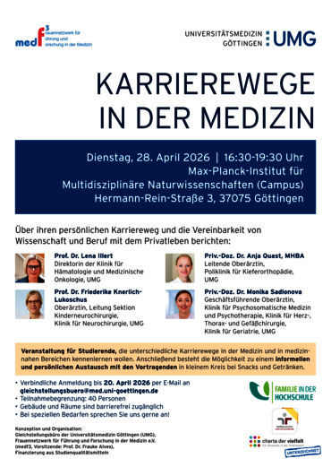 Jährliche Veranstaltung zur Karriereorientierung für Studentinnen und (Nachwuchs-)Wissenschaftlerinnen. Veranstaltet wird das Event vom Gleichstellungsbüro der UMG, dem Frauenführungsnetzwerk medf3 und der Fachschaft Unabhängige Mediziner. Insbesondere Studentinnen sollen mit diesem Format aktiv in der Gestaltung ihres Karrierewegs unterstützt werden und hier Impulse bekommen.