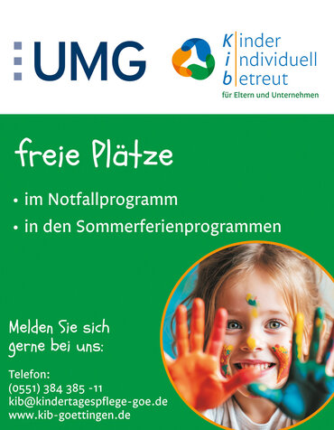 Beschäftigte der UMG sowie UMG zugehörige Personen können nach vorheriger Anmeldung bei der Kindertagespflege Göttingen e.V. (Abteilung Kib – Kinder individuell betreut) eine sogenannte Notfallbetreuung (z.B. beim Ausfall der Regelbetreuung, bei dienstlichen Terminen, während Diensten an Wochenenden u.s.w.) für ihre Kinder in Anspruch nehmen. Das Team des Kib vermittelt eine geeignete Betreuungsperson und die UMG finanziert die Kinderbetreuung von bis zu 30 Betreuungsstunden pro Kalenderjahr. Die sogenannten Kennlerntreffen sind auf 1,5 Stunden pro Treffen festgelegt und dienen dem reinen Kennenlernen der Betreuungsperson (dies entfällt, wenn die Betreuungsperson dem Kind bekannt und vertraut ist).