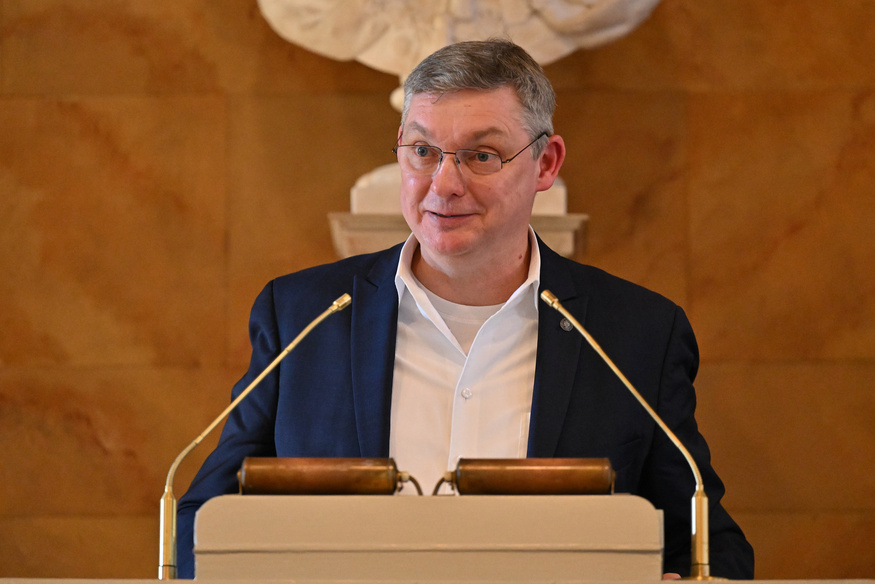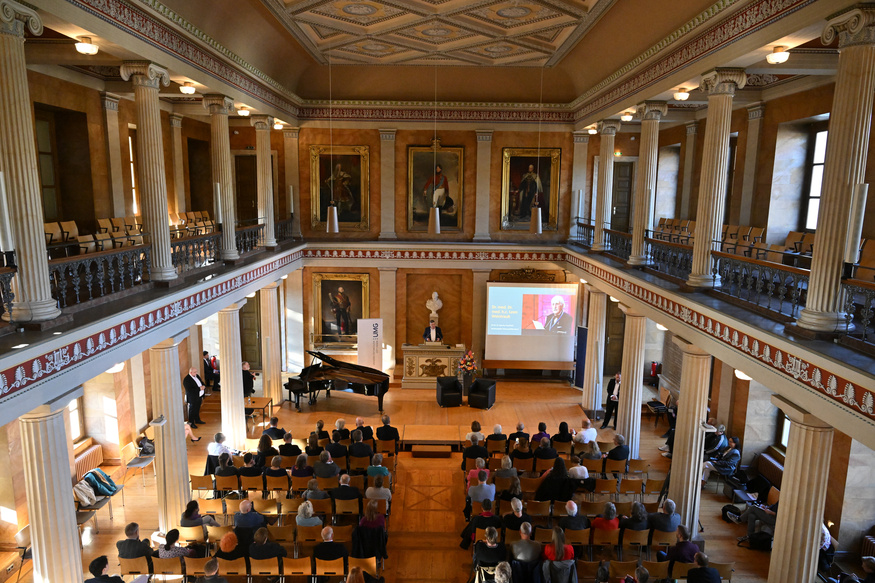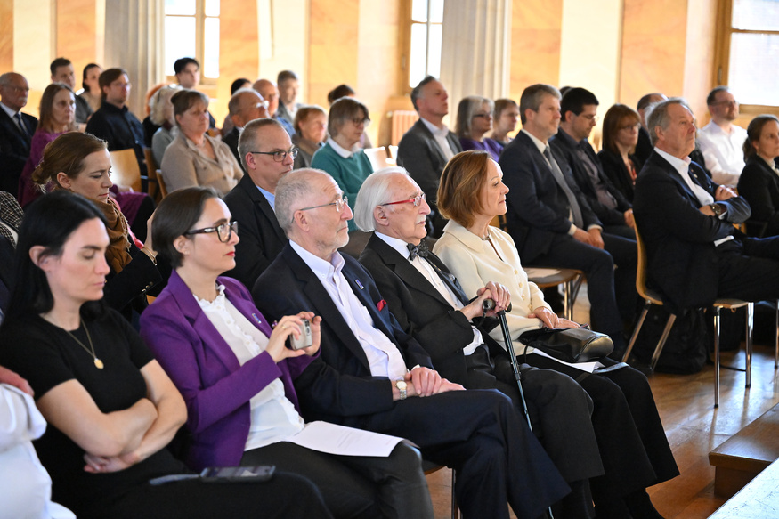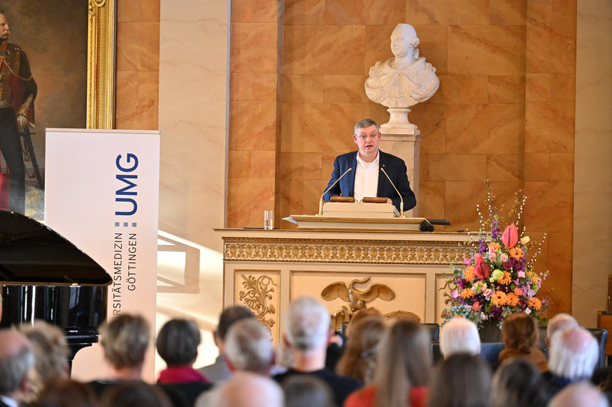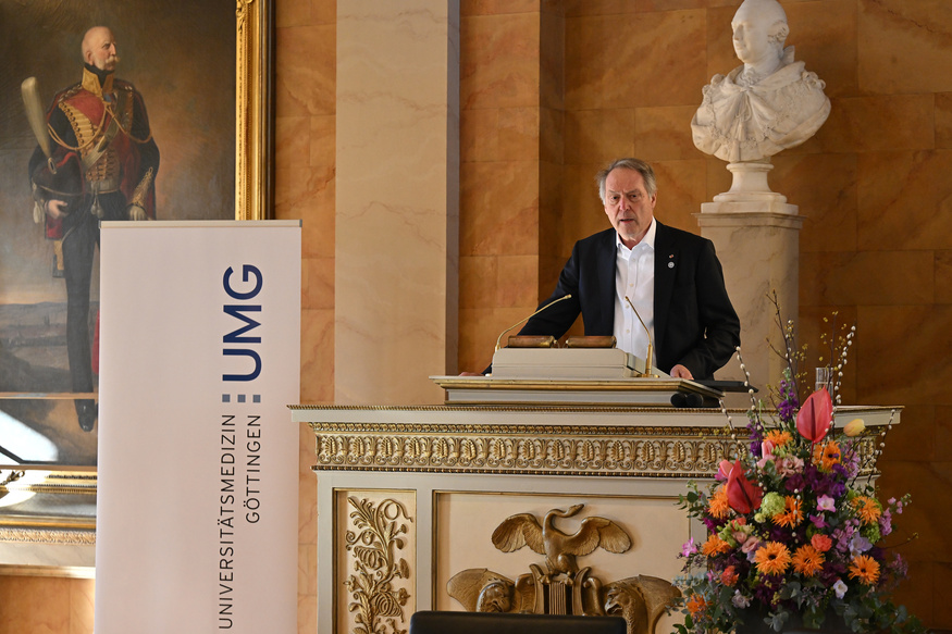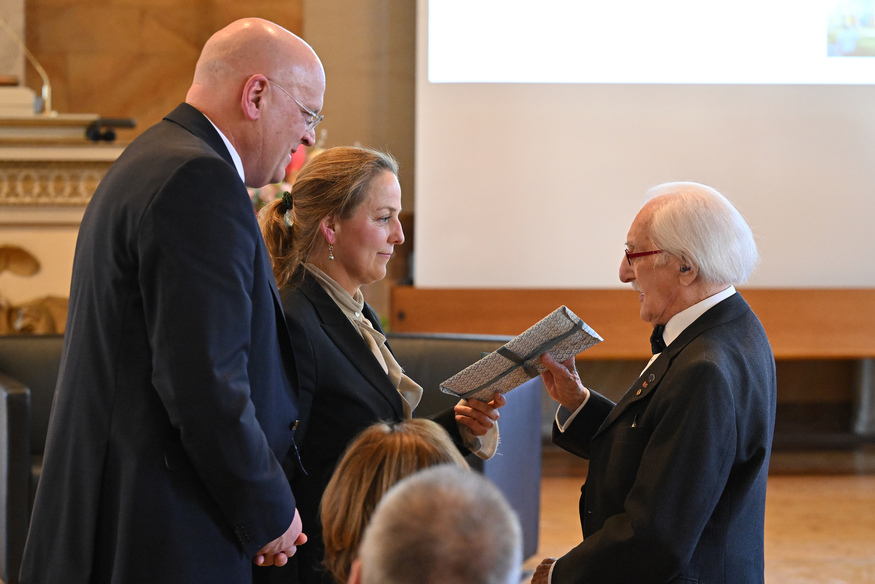 Zu Beginn der feierlichen Verleihung in der Aula am Wilhelmsplatz begrüßte Prof. Dr. Axel Schölmerich, Präsident der Universität Göttingen, die Gäste. Anschließend sprach Prof. Dr. Wolfang Brück, Dekan der Medizinischen Fakultät und Sprecher des Vorstandes der UMG, und nahm in seinem Grußwort Bezug auf das Leben von Dr. Weintraub – wie er sich als KZ-Überlebender zurück ins Leben kämpfte und 1946 ein Studium der Humanmedizin in Göttingen begann. In einem während des Krieges von massiver antisemitischer Gewalt geprägten akademischen Umgebung, dessen Nachklang zu Studienbeginn noch allgegenwärtig war: „Sie wurden Student in einem herausfordernden Umfeld und entschieden sich ganz bewusst für das Fach der Gynäkologie und Geburtshilfe, weil Sie sich für das Leben einsetzen wollten“, so Brück. „Bis heute, im Alter von 100 Jahren, teilen Sie noch immer Ihre Erfahrungen und erinnern an die vergangene Zeit, ohne zu belehren. Und zwar mit beeindruckender Positivität, Freundlichkeit und der Ihnen eigenen, tiefen Bescheidenheit – die mich mit Blick auf Ihre Lebensleistung sehr beeindruckt. Es ist ein großes Glück, dass wir Sie haben, dass Ihre Verbindung nach Göttingen bis heute bestehen geblieben ist, dass Sie die Erinnerung wachhalten und dass Sie so viele Menschen zur Versöhnung inspiriert haben. Dafür gebührt Ihnen unser aller Dank.“
