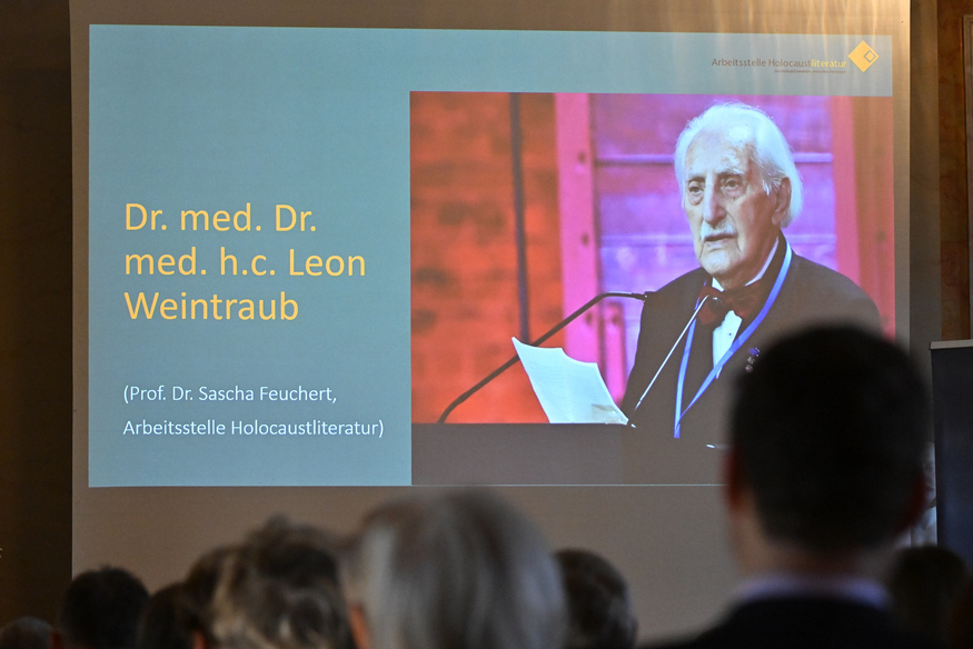 Die Laudatio zur Verleihung der Ehrendoktorwürde hielt Prof. Dr. Sascha Feuchert, Germanist und Leiter der Arbeitsstelle Holocaustliteratur sowie Geschäftsführender Direktor des Instituts für Germanistik der Justus-Liebig-Universität Gießen. Er gab einen Überblick über das Lebenswerk des 100-Jährigen und betonte: „Dr. Leon Weintraubs herausragendste Eigenschaft ist sein Wille zur Mitmenschlichkeit, der durch nichts zu brechen ist. Entsetzliche Verluste und brutale Leiderfahrungen haben ihn zwar geprägt, aber vermochten nichts daran zu ändern, dass er ein Philanthrop ist und bleibt. Doch seine Erfahrungen machen ihn auch zu einem Mahner, dessen Warnungen vor Rassismus, Antisemitismus sowie Gewaltherrschaft so glaubwürdig wie eindringlich sind.“