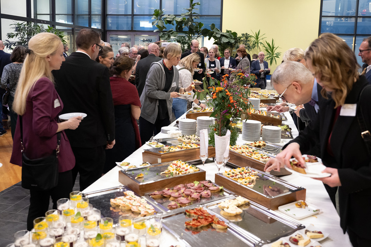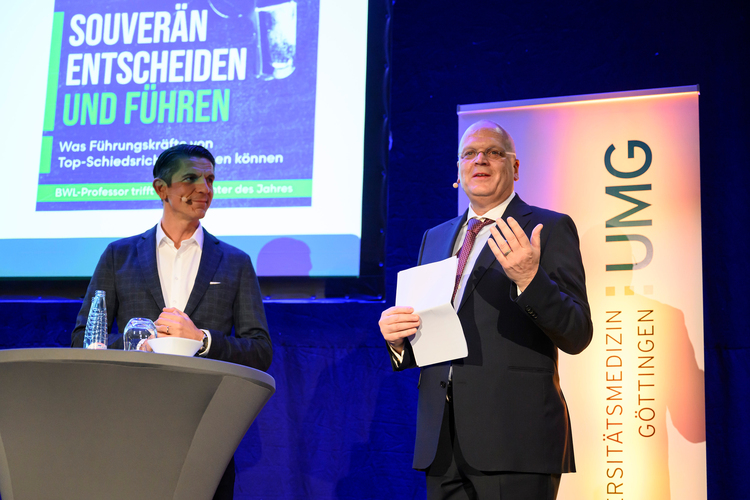 Spitzenvertreter*innen aus Politik und Landesbehörden, Wissenschaftseinrichtungen und Universität, Gesundheitseinrichtungen, Wirtschaft, Religion und Ehrenamt sowie Führungskräfte aus dem eigenen Haus, insgesamt mehr als 500 Gäste, fanden sich am Dienstag, 25. November, zum Jahresempfang der Universitätsmedizin Göttingen (UMG) ein. Die Keynote „Entscheidungen unter Druck“ von Fußballschiedsrichter Deniz Aytekin und eine anschließende Podiumsdiskussion zum selben Thema waren die inhaltlichen Höhepunkte der Veranstaltung.