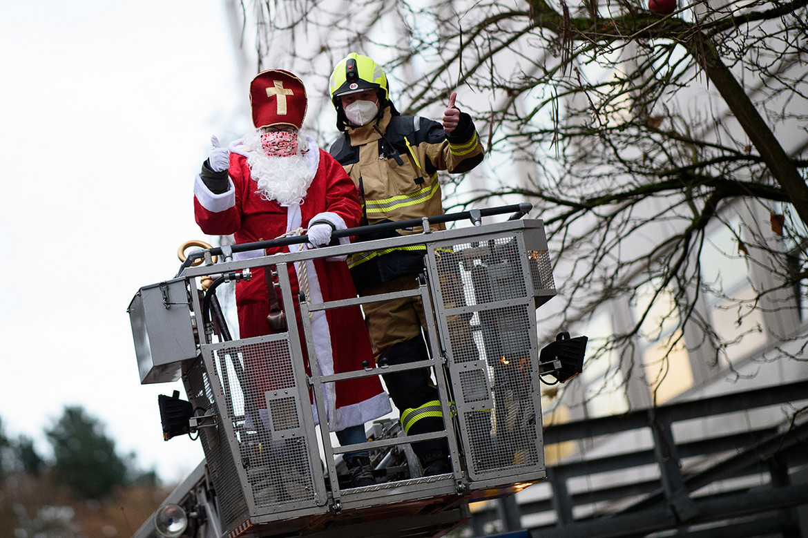 Oberbrandmeister Sascha Pinkale und Brandmeister Andre Wagner von der Feuerwache Klinikum unterstützten die Nikolausin mit der großen Feuerwehr-Leiter, genauer: einem Hubrettungsfahrzeug mit Drehleiter, an der Südfassade der Kinderklinik des Universitätsklinikums Göttingen. So konnten die Kinder aus ihren Zimmern heraus sehen, wie die Nikolausin ihnen zuwinkte. In diesem Jahr fuhr die Feuerwehr zusätzlich noch eine weitere Kinderstation an: Damit auch die Kinder des Operativen Kinderzentrums (OPKiZ) auf der Station 2023 im Bettenhaus 2 die Nikolausin sehen konnten, wurde die Drehleiter dort noch einmal ausgefahren.