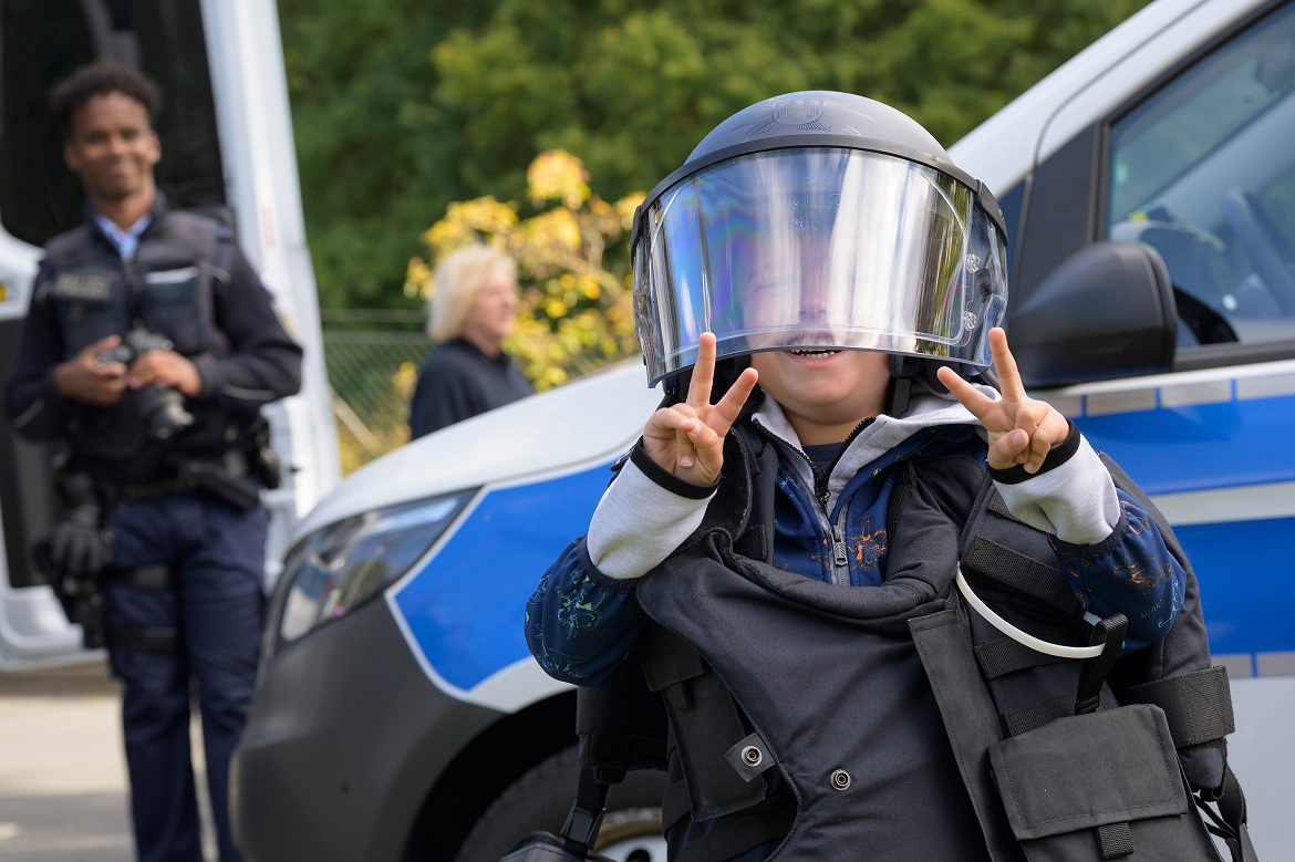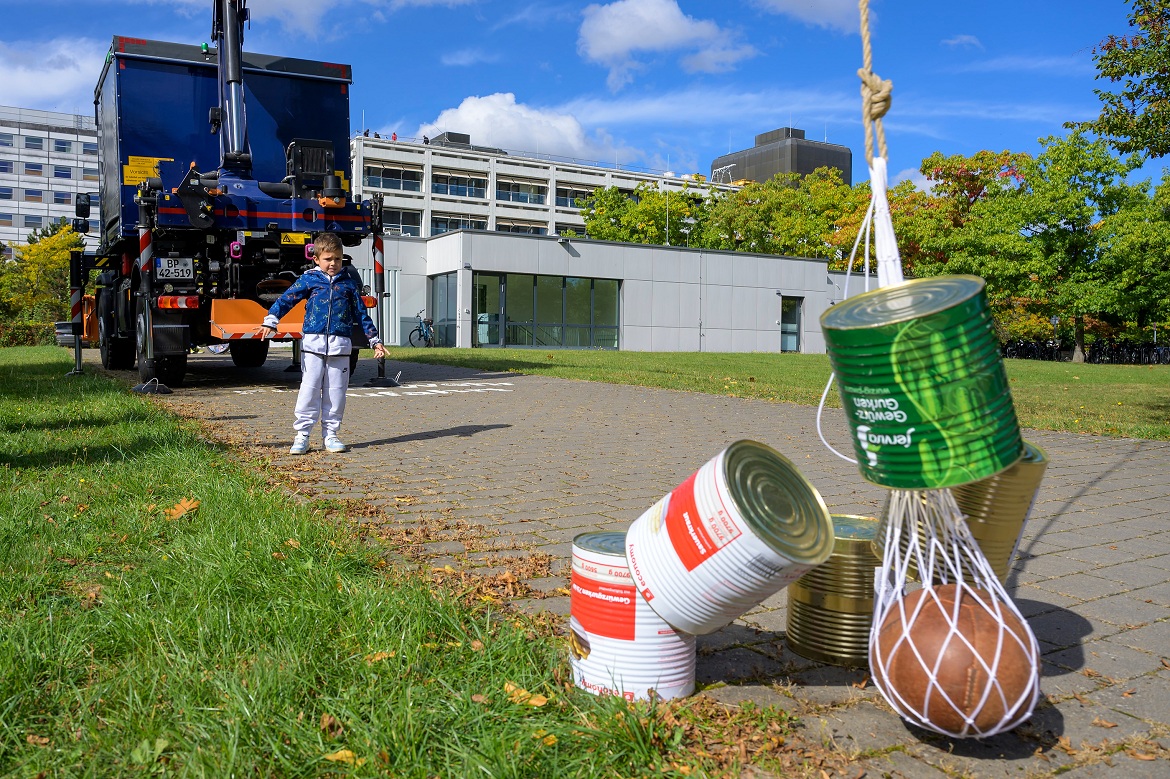 Den Spendenscheck in Höhe von 1.700 Euro überreichte Polizeihauptkommissar Immo Pfitzmann an Prof. Dr. Chris Mühlhausen, Stellvertreter der Direktorin der Klinik für Kinder- und Jugendmedizin der UMG. Anschließend waren die Kinder an der Reihe: Beim Dosenwerfen warfen sie einen Ball, der mit einem Seil am Lastarm des Polizeiunimogs befestigt war, wie ein Pendel gegen die Dosenpyramide. Beim „Heißen Draht“ führten die jungen Patient*innen eine Drahtschlaufe durch einen Drahtparcours, wobei jede Berührung des Drahtes Blaulicht und eine Sirene auslöste. Zudem nahmen sich die 19 Polizeibeamt*innen viel Zeit, um den Kindern ihre Fahrzeuge zu zeigen und zu erklären.