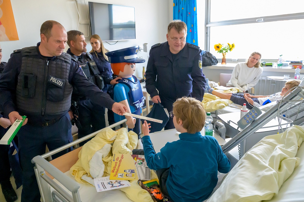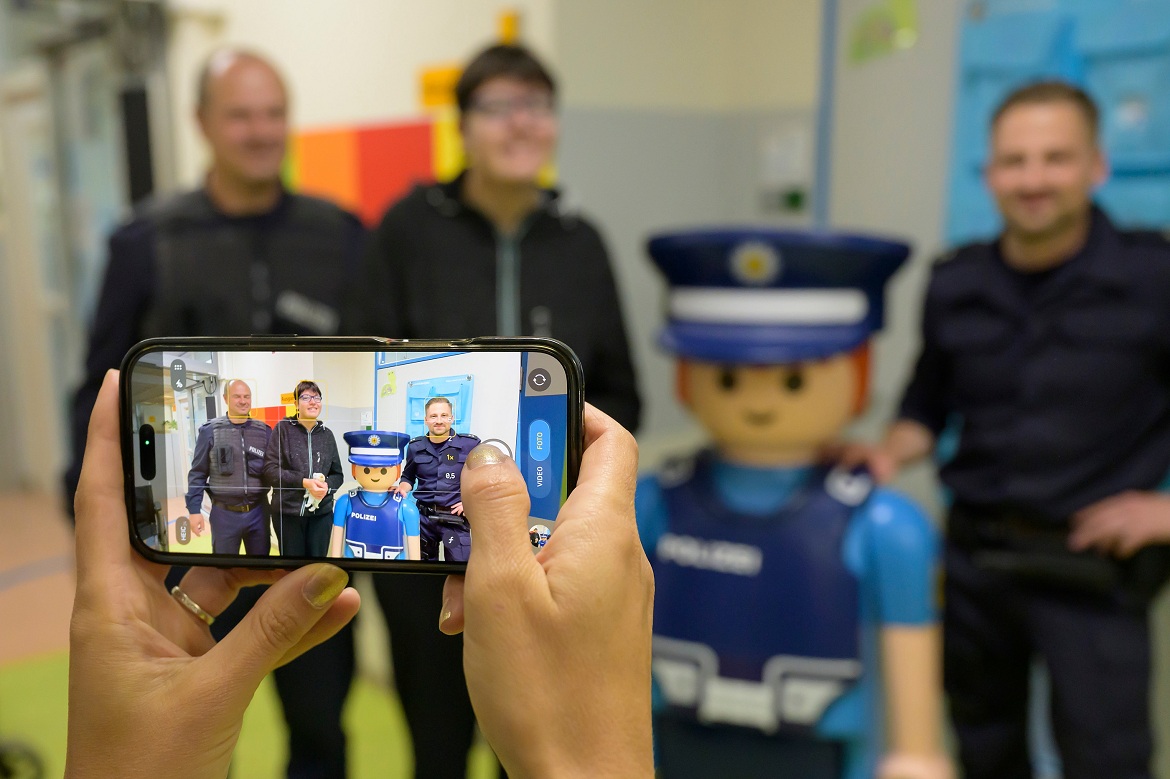 Mit einem großen Spendenscheck, Blaulichtfahrzeugen, Spielen, kleinen Geschenken und einem lebensgroßen Spielzeugpolizisten war die Bundespolizei Duderstadt am Mittwoch, 24. September 2025, in der Klinik für Kinder- und Jugendmedizin der Universitätsmedizin Göttingen (UMG) zu Gast. Bereits zum 17. Mal sammelten die Bundespolizist*innen innerhalb ihrer Belegschaft für das Kinderpalliativzentrum der UMG. Dafür verzichteten sie unter anderem auf einen Teil ihrer Wochenend- und Nachtzuschläge.