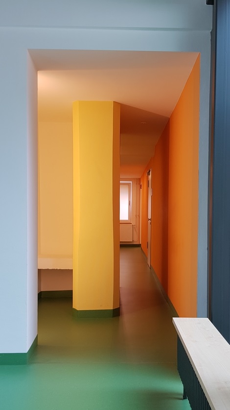 Oberlichter in den Verkehrsflächen und der Bewegungshalle versorgen die Bereiche mit viel Tageslicht und sorgen für eine besondere atmosphärische Stimmung. Eine Farbgestaltung mit ruhigen dezenten Farben und gezielt eingesetzten Kontrasten sorgt für den notwendigen Hintergrund für die therapeutische Arbeit. Natürliche Materialien wie Holz, Putz, Sichtbeton und Linoleum unterstützen den gewünschten Charakter des Hauses.