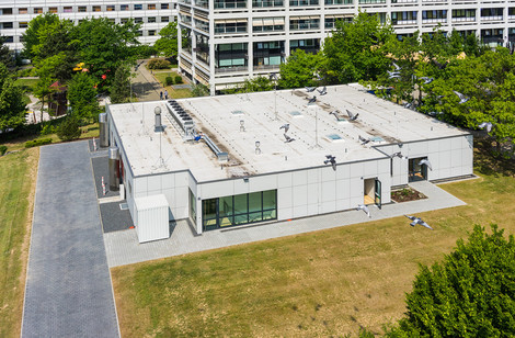 Der kompakte Baukörper hat eine Hauptnutzfläche von 1.930 m², die sich über zwei Geschosse erstreckt. Die Technikzentrale bildet auf knapp der Hälfte der Gebäudegrundfläche das dritte Geschoss.