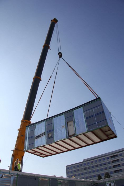 Die Firma Cadolto, die als Generalunternehmer für die schlüsselfertige Realisierung durch ein Ausschreibungsverfahren den Auftrag erhielt, produzierte die 20 bis 28 to. schweren Module, wetterunabhängig in ihrem Werk bei Nürnberg. Die 16 Module mit einer max. Breite von 4,45 m und einer max. Länge von 18,10 m, die bereits mit Fliesen, Steckdosen, Fenstern, Türen und Sanitärobjekte ausgestattet waren, wurden nachts, aus dem etwa 400 KM entfernten Cadolzburg, mit 30 m langen Schwerlast-Tiefladern nach Göttingen transportiert. Dort wurden die Bauteile mit einem Gesamtgewicht von 280 to. durch 2 Kräne mit 40 m Ausladung und 200 bzw. 500 to. Traglast – nur 2 Monate nach Beginn der Erdarbeiten – innerhalb von 2 Tagen passgenau auf die Teilunterkellerung und Fundamente platziert.