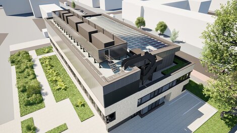 Den östlichen Teil des Dachgeschosses nimmt die Technikzentrale mit Lüftungszentralen und Heizungsraum ein. Von der nördlichen Terrasse am Treppenhaus führt eine Außentreppe auf die Dachfläche der Technikzentrale, auf der eine eingehauste Stahlbühne zur Aufstellung der Kompressionskältemaschinen und Wärmepumpen geplant ist.