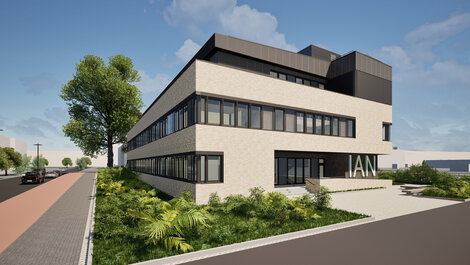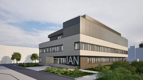 Neben der angepassten und zum UMG-Campus vermittelnden Geschossigkeit wird sich das IAN durch die Verwendung von hellem Klinker als Fassadenmaterial in die bauliche Umgebung einfügen. Das Dachgeschoss erhält eine dunkle Fassade aus Metall. Die vornehmlich als Bandfassade gestalteten Fensteröffnungen prägen eine klare Gestalt des Gebäudes und bieten ein hohes Maß an Flexibilität für den Anschluss von Trennwänden.