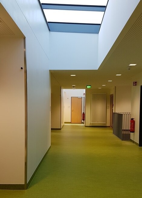 Durch die Integration des Altbaus in das Gesamtkonzept der Tagesklinik konnte der Großteil der Räume, die keine Sichtbeziehung nach außen benötigen - vor allem WC- und Waschräume - im Bestand auf der eingegrabenen Südseite untergebracht werden. Die übrigen dunklen Räume des Bestandsgebäudes werden nun für Nebenräume und Technik genutzt.