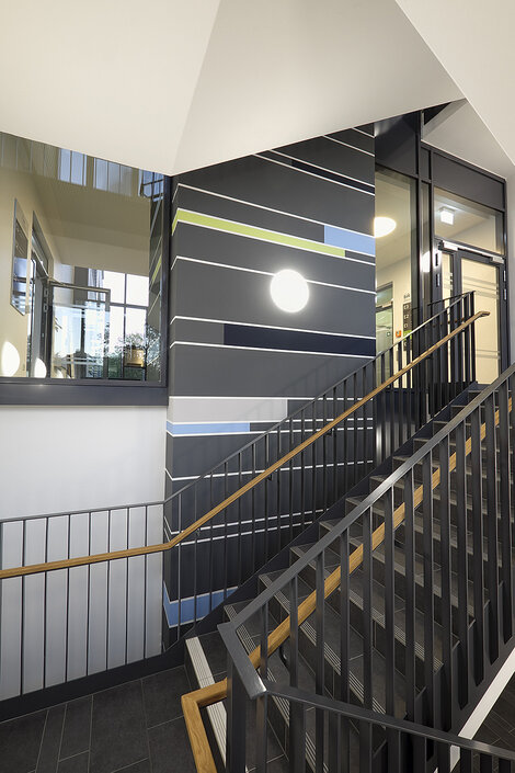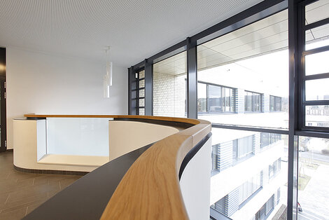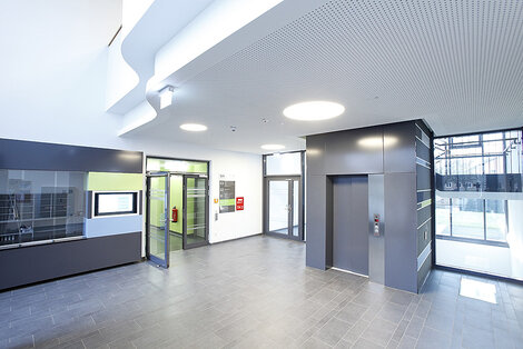 Im südlichen Bereich definiert eine eingeklappte Pfosten-Riegelfassade im Erdgeschoss den Eingang und führt Besucher direkt in das Foyer und zur Anmeldung.