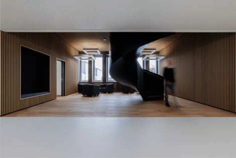 Die gestalterische Ausformulierung innerhalb des Gebäudes ist schlicht, funktionell, aber hochwertig. Das Prinzip der Vertikalität der Fassade wird im Inneren fortgesetzt. So wurde beispielsweise die Bekleidung der Wände und Teile der Decken in den Aufenthaltsbereichen Foyer und Think Tanks mit vertikalen Holzlamellen ausformuliert.