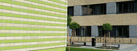 Klinker, Metall und Glas prägen die Anmutung des Institutsneubaus. In zeitgemäßer Anwendung greift das Fassadenmaterial Klinker die bauliche Tradition der seinerzeitig umliegenden Gebäude auf.